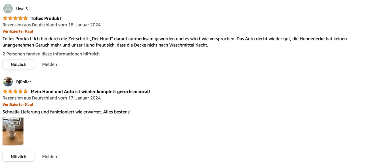 Wir sind sehr begeistert von dem Test. Egal ob Sofa, Teppich, Auto und Sofakissen, alles wird geruchsfrei nach der Anwendung und der Trocknung wie versprochen. Auch bei Josie ist ihr Geruch verschwunden. Von uns bekommt das Produkt die Höchstpunktzahl an Pfötchen. Der Geruch im Haus nach Hund muss nicht mehr mit Duftsprays unterdrückt werden, ist bei regelmäßiger Anwendung nicht mehr da. Von der Anwendung her ist das Spray sehr gut, eine Sprayflasche war nach ein paar Mal drücken defekt, aber wir hatten ja die leere aufgehoben.